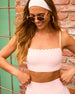 Grace meets performance with the At The Barre Scallop Trim Sport Bra. This chic, ballet core-inspired piece features a soft stretch jersey fabric, while the built-in shelf bra with removable padded bust ensures just the right amount of mid support. Adjustable shoulder straps offer a customizable fit, and the delicate scallop trim adds a touch of elegance to your activewear look. Pair it with the matching At The Barre Scallop Trim Mini Skort (sold separately) for a look that’s as graceful as it is stylish.