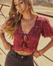 Sweet, breezy, and a little bold, the Carmalyn Front Tie Top is just how we like our fall moments. Made from lightweight pleated chiffon with delicate lace ruffle trims, it floats effortlessly while still feeling polished. Dual front ties add a flirty, adjustable touch, and puff sleeves with elastic cuffs give it that feminine volume we love.