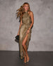 Make a dazzling entrance and celebrate in style with the Gisella Metallic Halter Maxi Dress. This show-stopping maxi dress is all about drama and elegance, featuring pleated metallic fabric that shimmers beautifully with every move. The halterneck tie closure highlights your shoulders and adds a touch of glamour, while the detachable waist tie allows you to create a perfectly cinched silhouette or go with a relaxed fit.