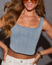 When the night calls for denim, the Kesia Corset Denim Tank Top steps in with major main-character energy. Designed in soft stretch denim that hugs in all the right places, this sultry little number features a boned bodice that gives you that snatched silhouette with zero effort. It’s equal parts throwback and right-now, perfect for a rooftop toast, dancefloor takeover, or flirty dinner plans.