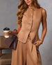 Fall’s fresh new favorite? You just found it right here with the Letters From Autumn Vest Top. Pleated jersey fabric shimmers softly with a subtle sheen, while the stretch fit and contour seams sculpt for an effortlessly polished look. The etched front button closures add a dash of modern edge, making this vest top perfect for layering or wearing solo. Whether paired with the matching Letters From Autumn Trouser or your favorite denim, it’s the ultimate piece to elevate your fall wardrobe with a relaxed yet refined vibe.
