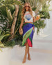 The Michelle Abstract Wrap Midi Skirt is your effortless answer to vacation dressing with a twist. Featuring a silky satin finish and a bold abstract print, this flowy wrap design brings instant elegance with zero effort. The attached tie closure cinches the waist just right, while the skirt overlay adds soft movement that catches the breeze and a few compliments.