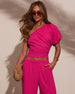 Meet your new style obsession: the Onyx Linen One Shoulder Top. With its flirty one-shoulder silhouette and ruched linen texture, this top is all about laid-back glam with a twist. The elastic neckline keeps it comfy while adding just the right amount of structure, so you can dance, dine, or daydream in style. Pair it with the matching Onyx Linen Wide Leg Pants for an effortlessly chic set.