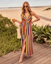 Slip into sunshine and effortless elegance with the Shalie Plunging Neckline Maxi Dress. This woven beauty flaunts a playful multi-color stripe design that catches every eye, while the twist detail at the plunging neckline adds a hint of flirty sophistication. Flowing freely with a daring slit at the hem, it’s made for graceful moves from beachside strolls to sunset soirées.