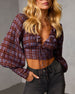 Turn heads from golden hour to last call in the Sundown Boheme Plaid Lace Up Top, a bold mix of structure, softness, and serious Western boho energy. The crinkle chiffon plaid fabric brings texture and edge, while padded shoulders and bishop sleeves with banded cuffs add a polished touch. The ruffled neckline and lace-up front serve flirty drama, balanced by an open back with tie and button closures that keep things unexpected.